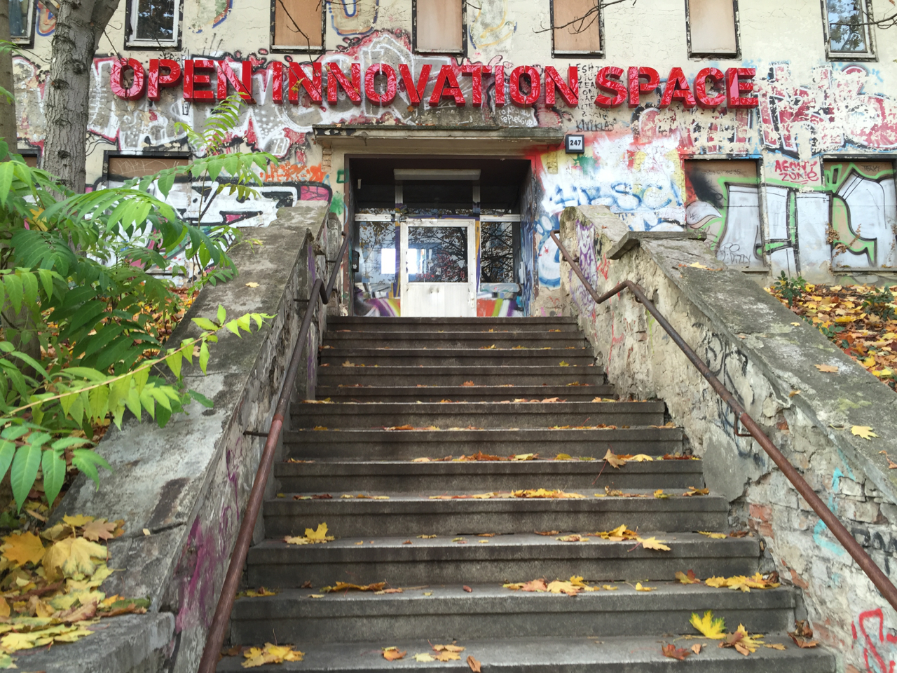 最新機材が取り揃えられたFabLabの隣にあるのは、Open Innovation Spaceという、なにやら廃屋っぽい建物。Makeドイツ語版によれば、前記した醸造所のオーナーは、オートボックという医療機器関連企業の創業者の家族で、ベルリンの未来に備えてこの広大な空間をオープン・イノベーションの拠点として投資していくとのこと。