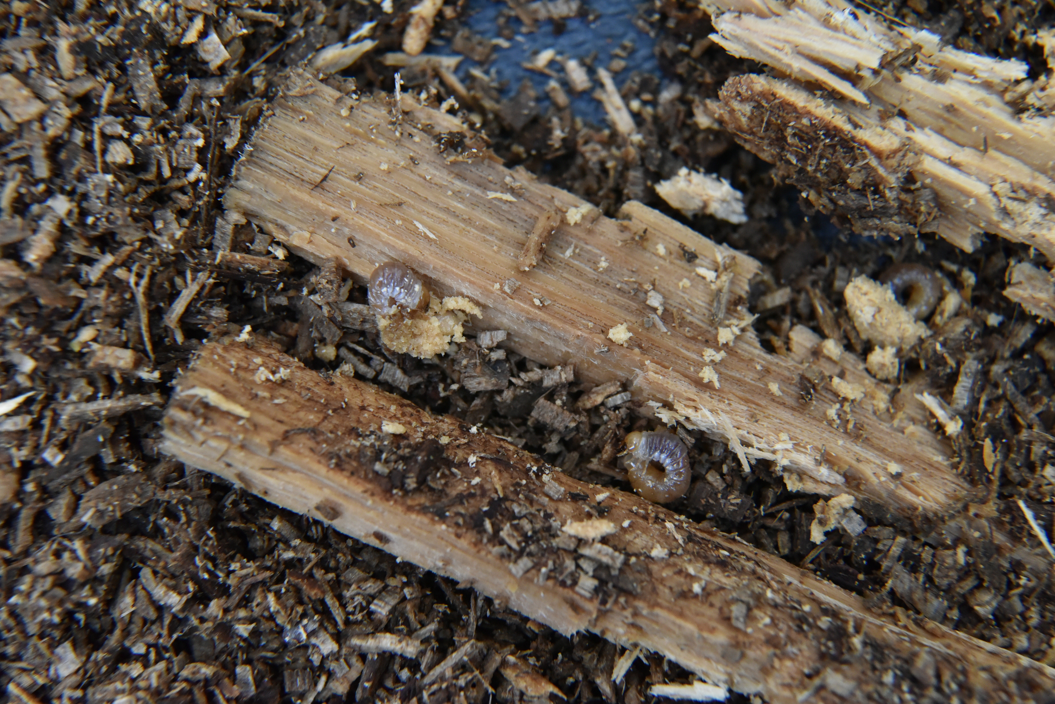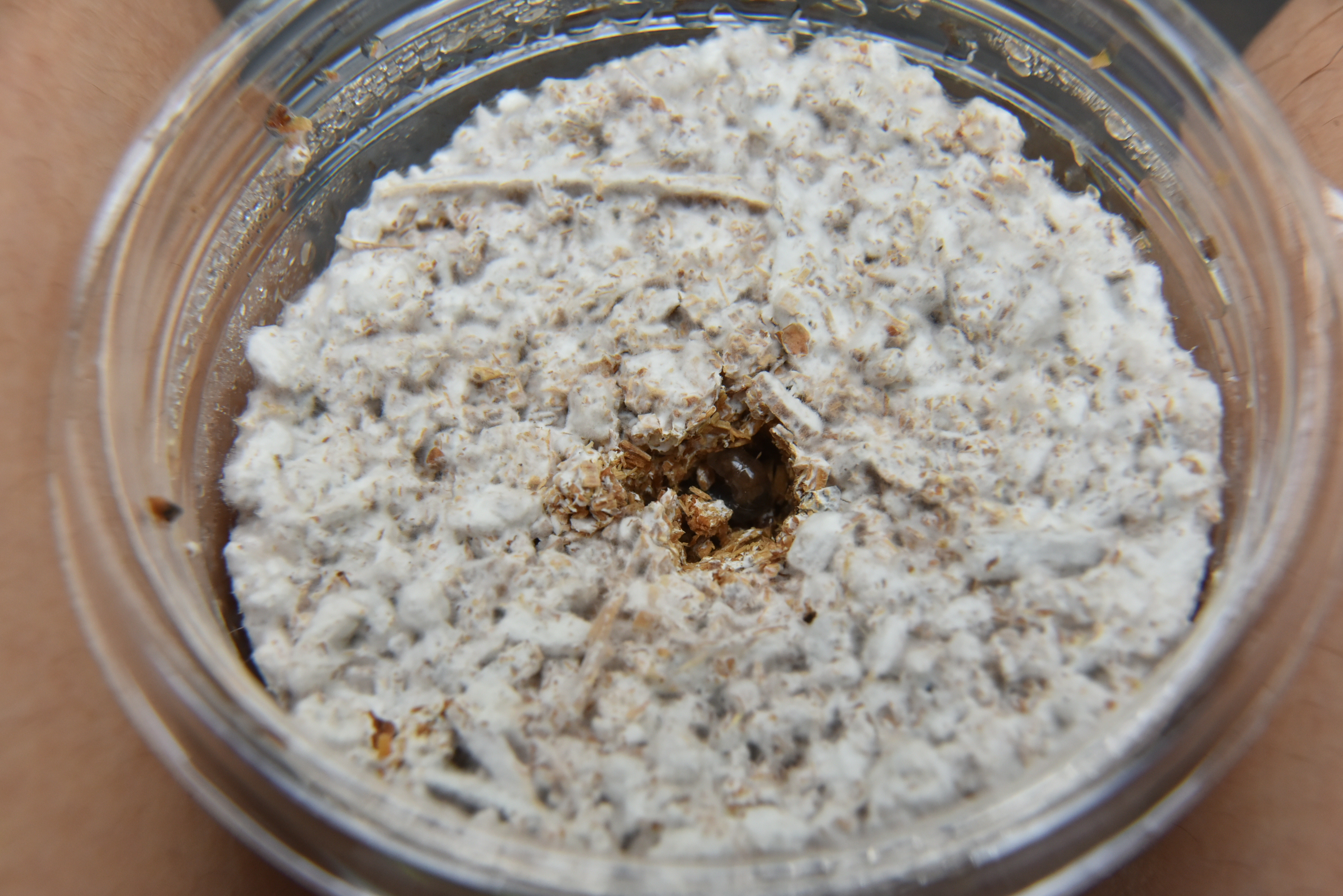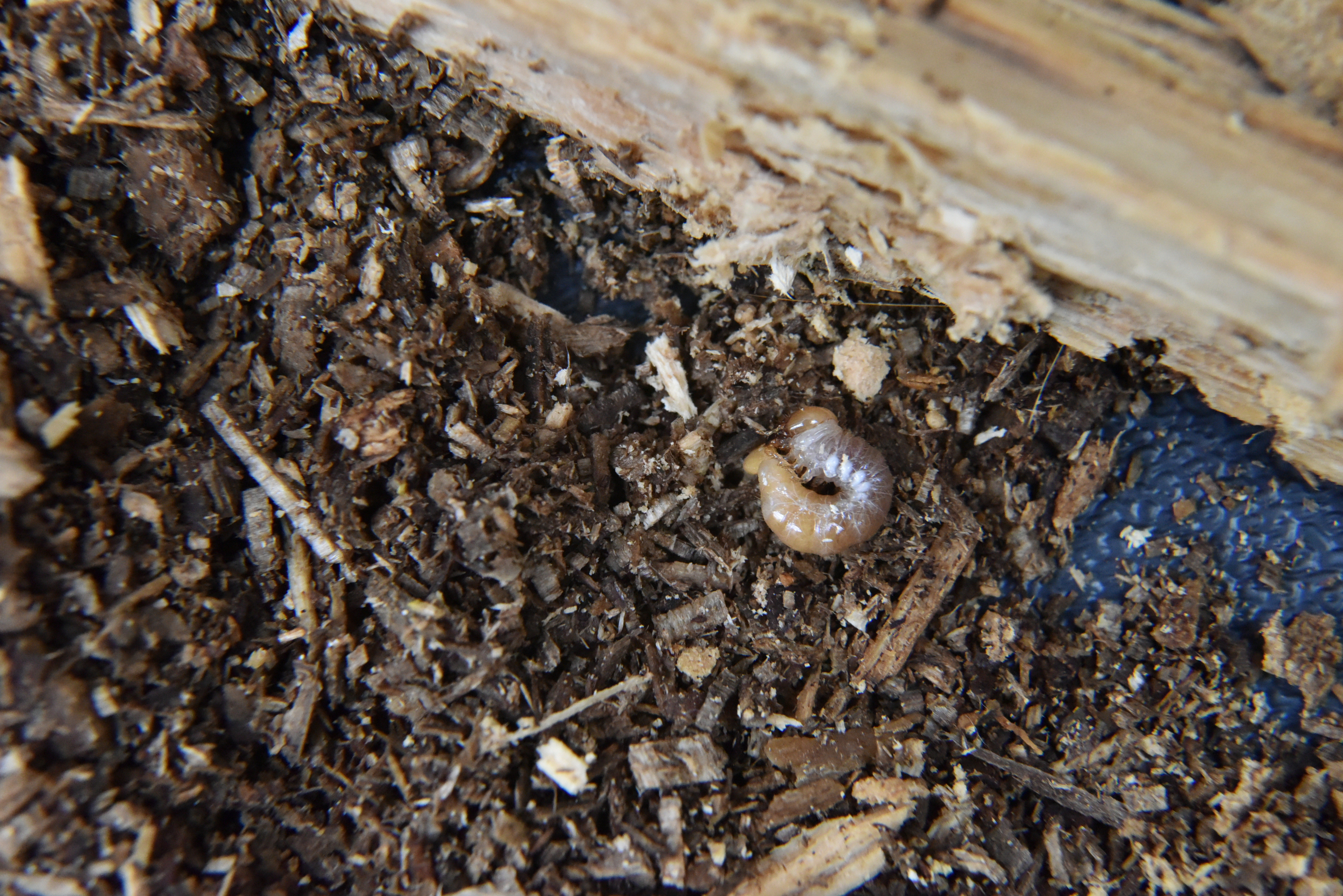 菌糸が繁茂するこんなに硬いクリスピー状のマットの中で、幼虫は生きていけるのでしょうか? でも、硬い朽木の中に穴を空けていたくらいだから、大丈夫でしょ!と自信がなくなる自分を説得。